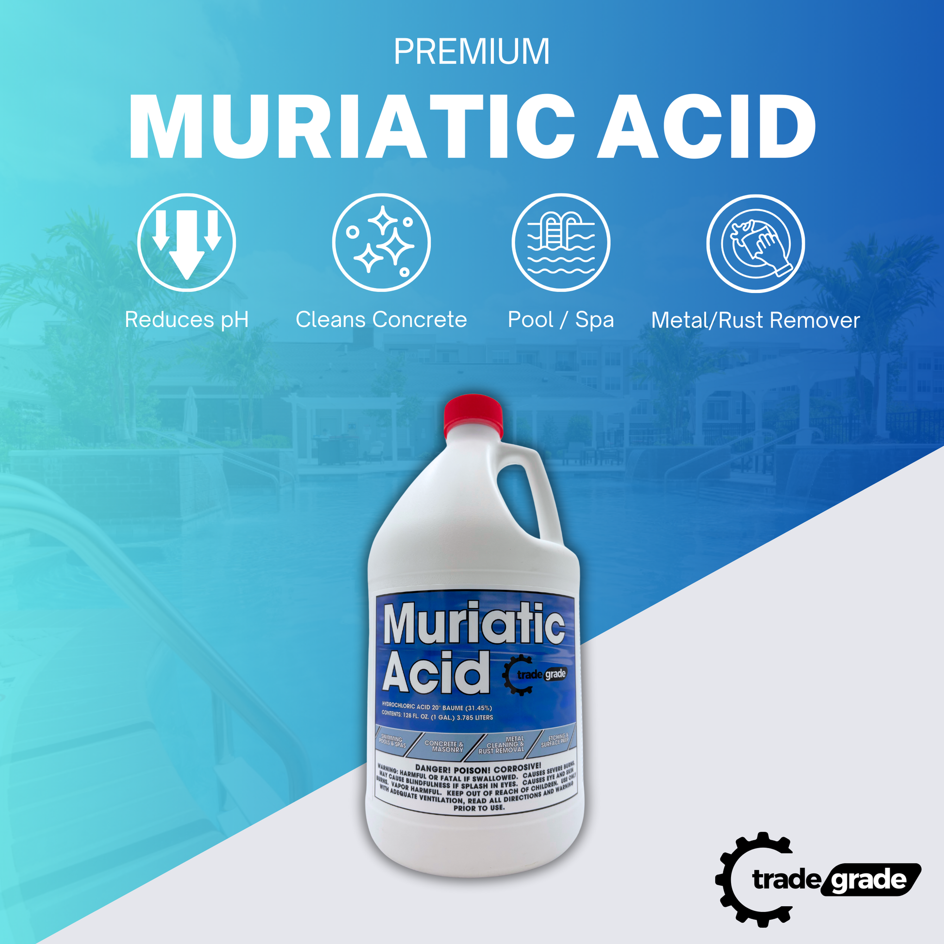TradeGrade Muriatic Acid is a professional-grade 31.45% hydrochloric acid solution (20° Baume) designed for various applications, including swimming pool maintenance and concrete surface preparation. Its high purity ensures effective results for both residential and commercial use.