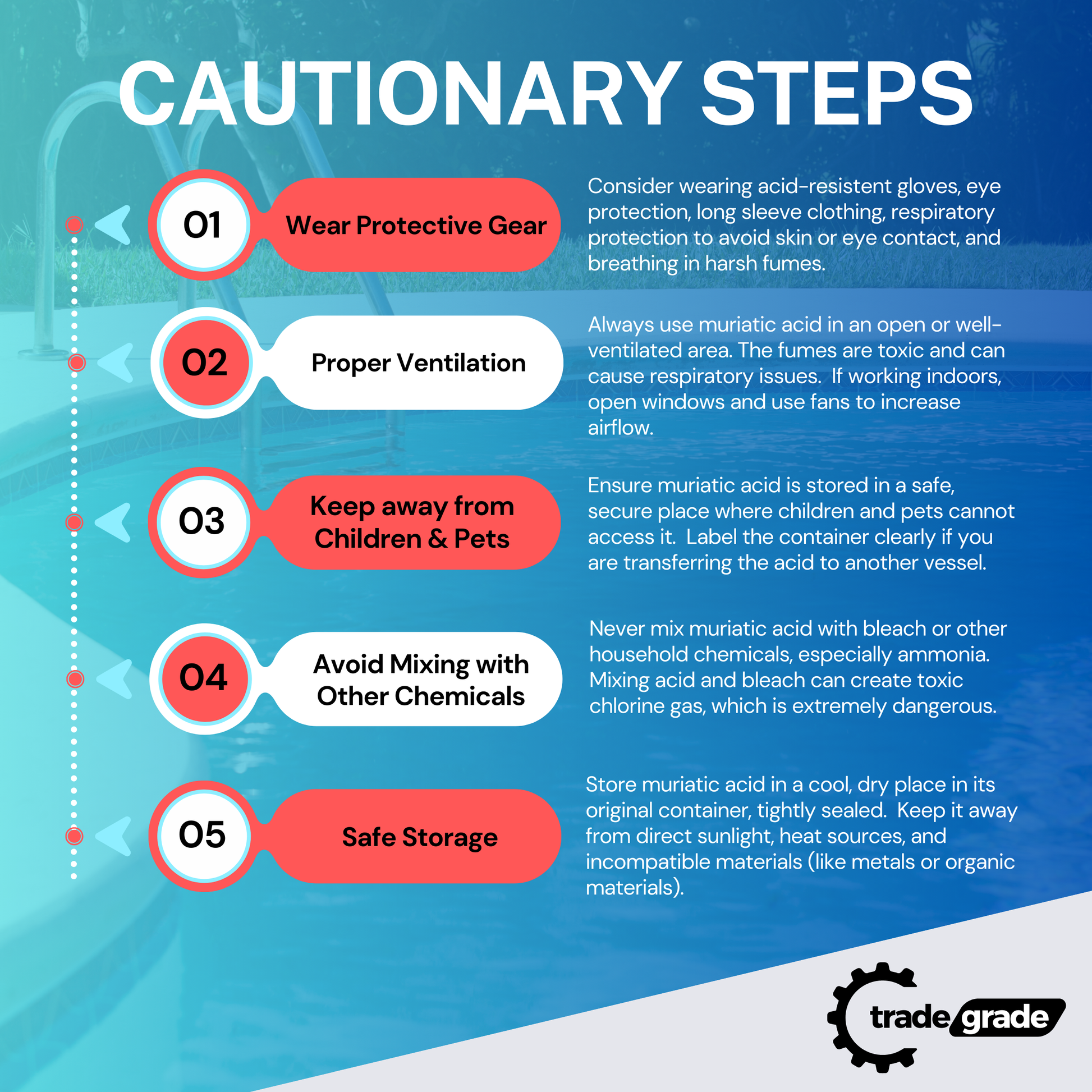 - What safety measures should I take when handling muriatic acid? Always wear appropriate protective gear, including gloves and safety glasses. Use in well-ventilated areas, and store the acid in a cool, dry place away from direct sunlight and incompatible materials.